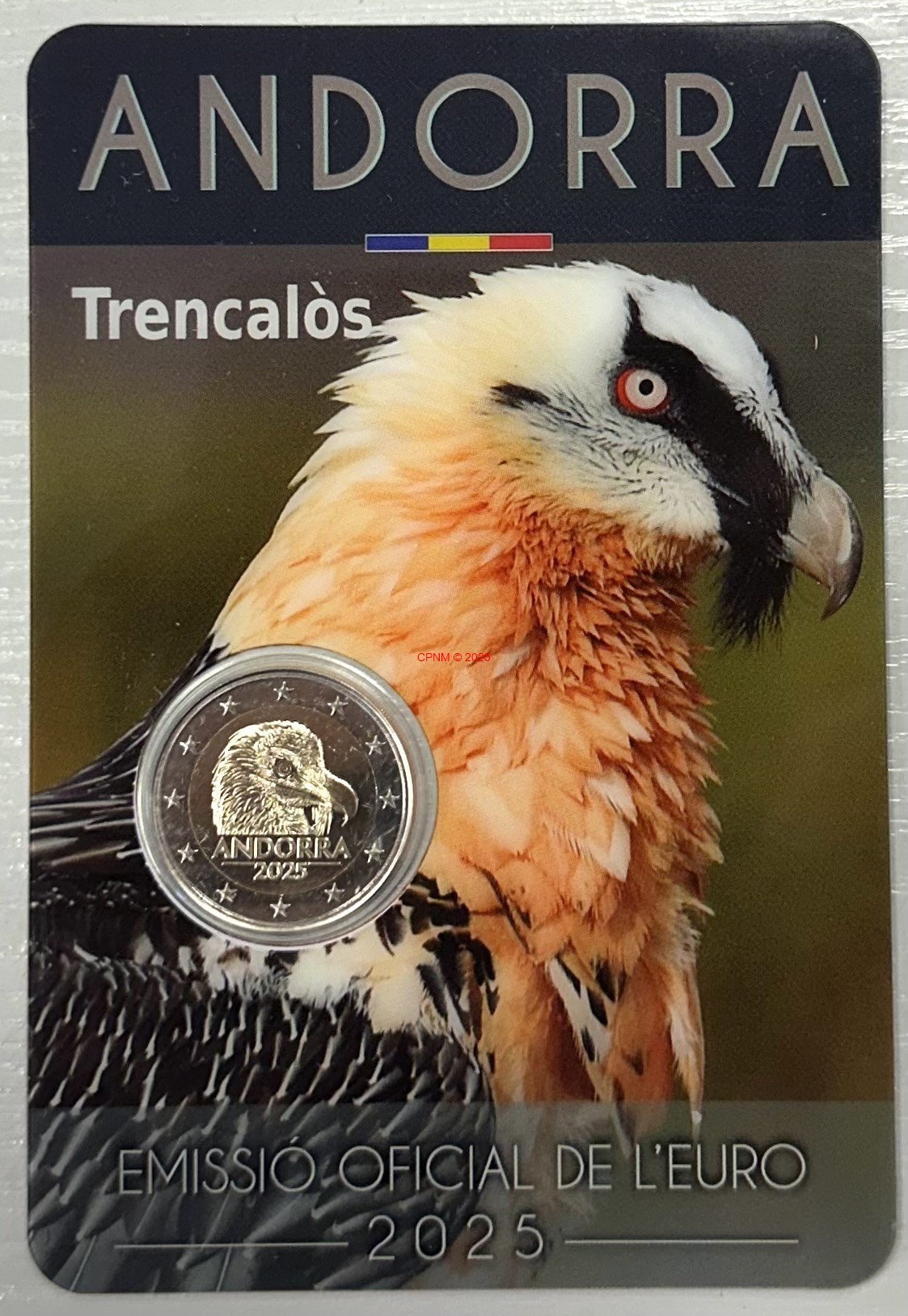 ANDORRE, 2 € commémorative 2025 "Gypaète barbu", dans sa coin card d'origine (BU).