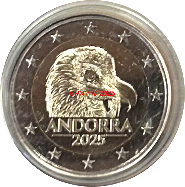 ANDORRE, 2 € commémorative 2025 "Gypaète barbu", livrée sous capsule.