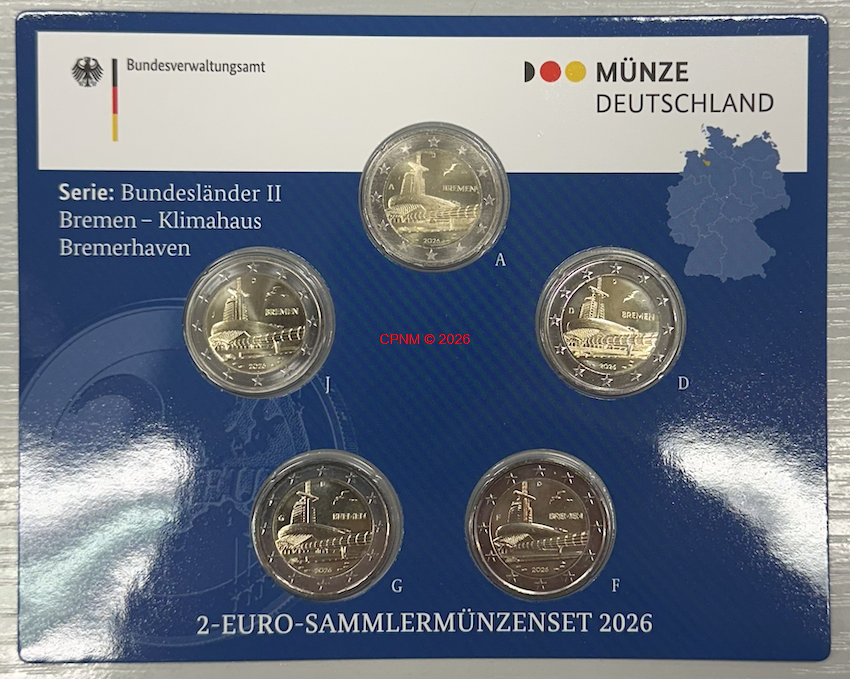 ALLEMAGNE, 2 € commémorative 2026 "Bremen", série des 5 ateliers monétaires (A, D, F, G et...