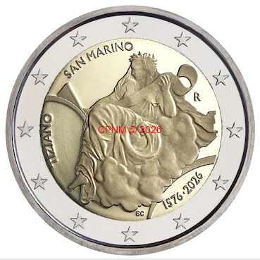 SAINT-MARIN, 2 € commémorative 2026 "TIZIANO", frappe Belle Epreuve en POLISSAGE INVERSE. ...